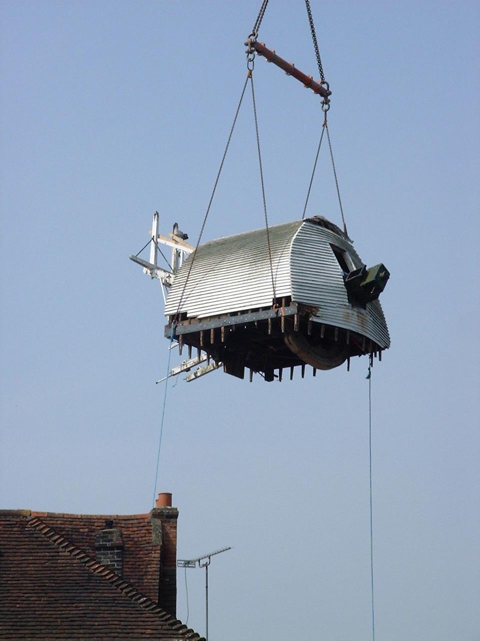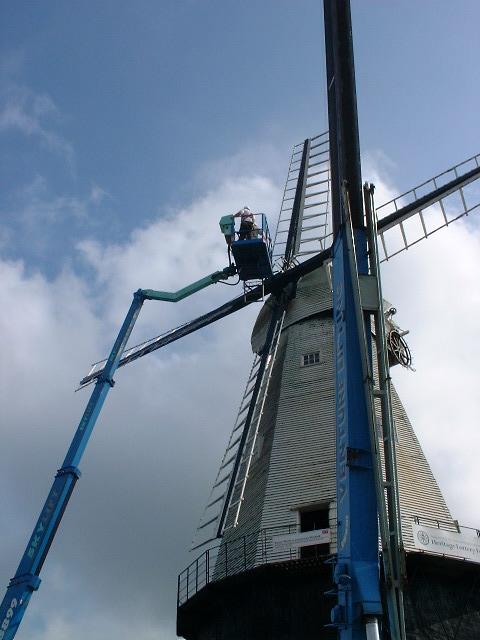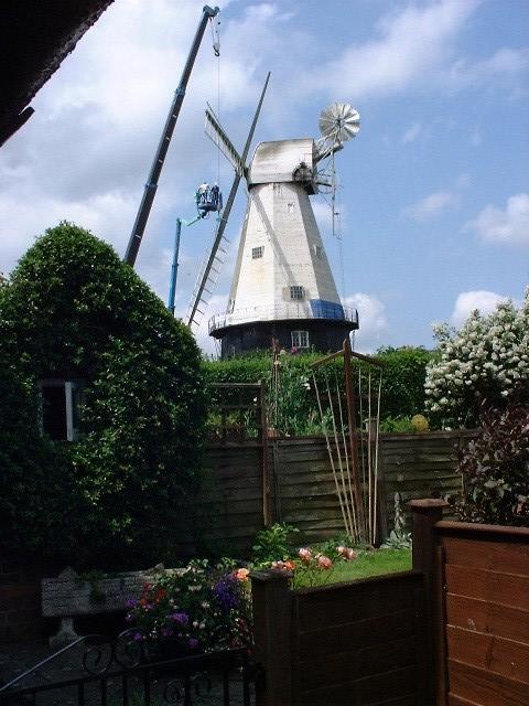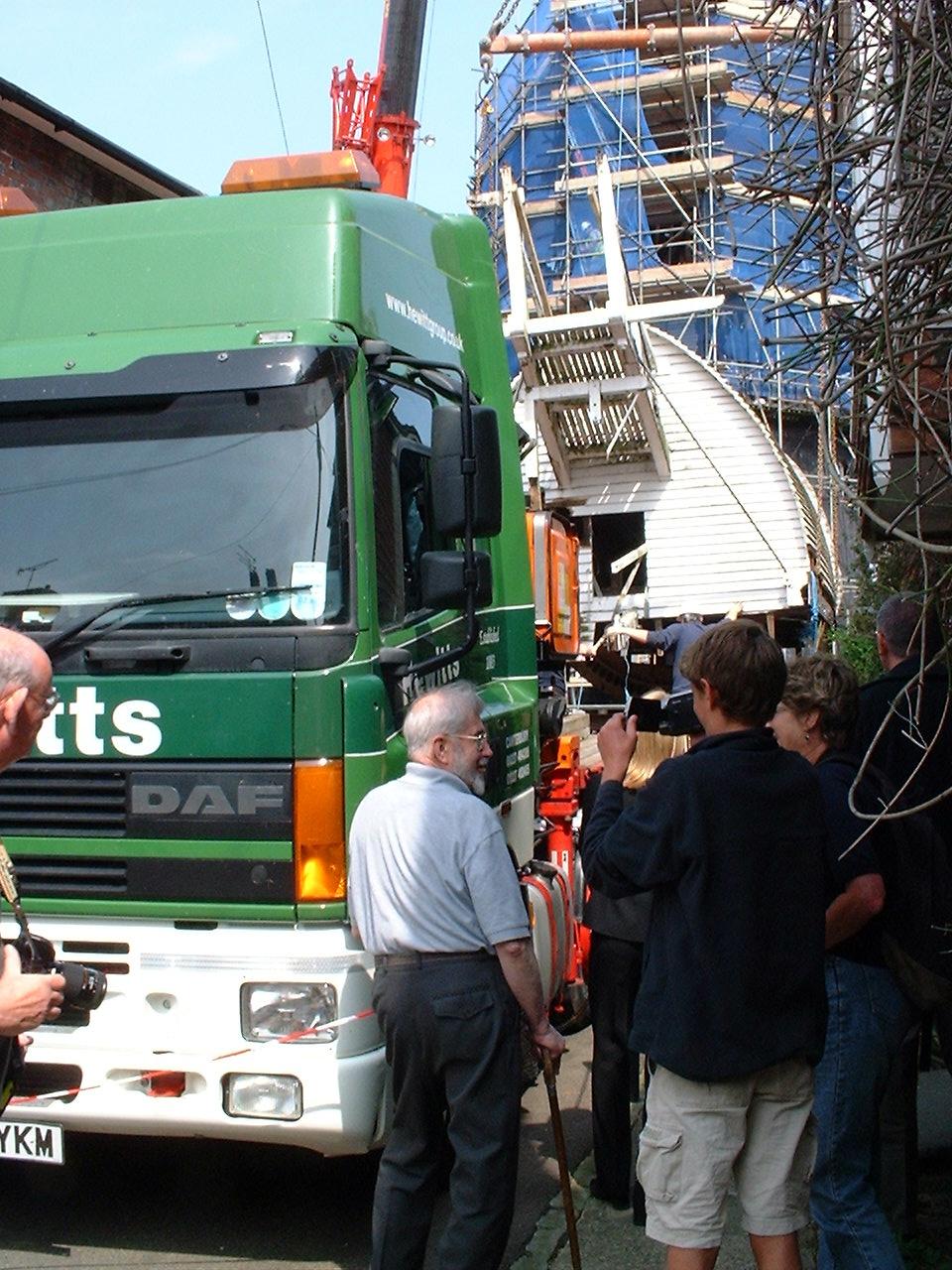 During 2002 and 2003, the mill underwent major renovations funded jointly by Kent County Council and the National Lottery Heritage Fund. The old sweeps with hollow steel stocks were removed during July, 2002 - see the pictures below. New sweeps with laminated wooden stocks and patent shutters were constructed at the millwrights, IJP (formerly The Chiltern partnership), near Henley-on-Thames. These are lighter than the old sweeps and have been rebuilt with a better "weather" (twist) so are much more efficient at catching the wind. The mill was clad with scaffolding in April 2003 so that the weatherboarding could be renewed and the lower boards of the cap also removed to facilitate the lifting of the cap from the top of the smock. The cap was transferred by crane to a low-loader on 23rd April 2003 (St.George's Day) and transported to the millwright's in south Oxfordshire for repairs. The cap without the fantail and sweeps weighed 7.5tonnes, according to the crane's equipment. As can be seen from the pictures below, there wasn't a lot of room to spare in the approach road! A temporary wooden roof was fitted to the smock to keep out the weather. Photos kindly supplied by Maurice Fry |