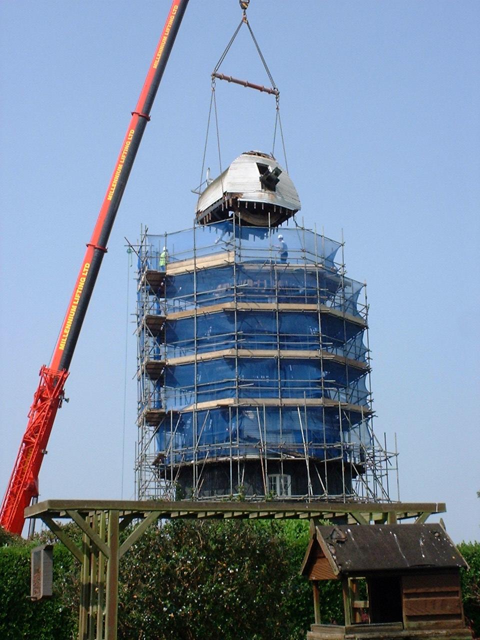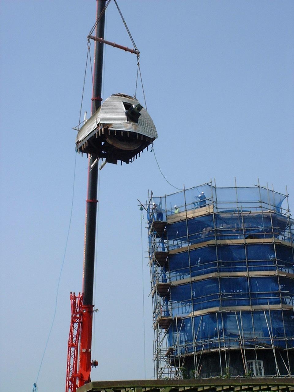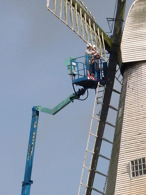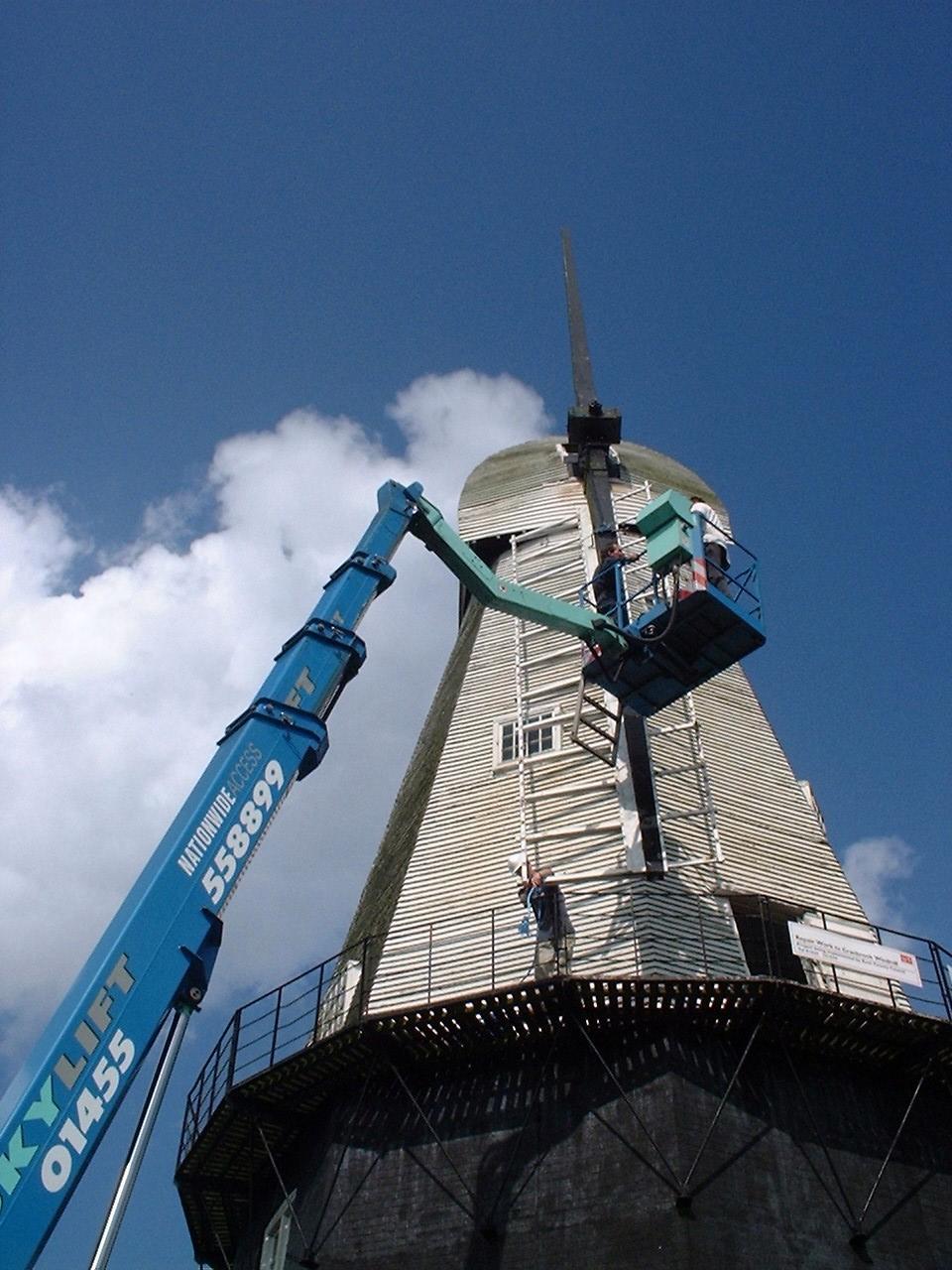 During 2002 and 2003, the mill underwent major renovations funded jointly by Kent County Council and the National Lottery Heritage Fund. The old sweeps with hollow steel stocks were removed during July, 2002 - see the pictures below. New sweeps with laminated wooden stocks and patent shutters were constructed at the millwrights, IJP (formerly The Chiltern partnership), near Henley-on-Thames. These are lighter than the old sweeps and have been rebuilt with a better "weather" (twist) so are much more efficient at catching the wind. The mill was clad with scaffolding in April 2003 so that the weatherboarding could be renewed and the lower boards of the cap also removed to facilitate the lifting of the cap from the top of the smock. The cap was transferred by crane to a low-loader on 23rd April 2003 (St.George's Day) and transported to the millwright's in south Oxfordshire for repairs. The cap without the fantail and sweeps weighed 7.5tonnes, according to the crane's equipment. As can be seen from the pictures below, there wasn't a lot of room to spare in the approach road! A temporary wooden roof was fitted to the smock to keep out the weather. Photos kindly supplied by Maurice Fry |